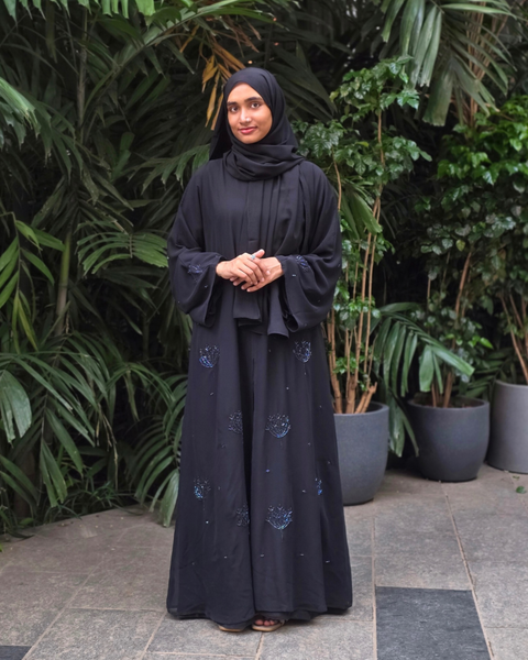 Experience luxury and modesty in one silhouette with our Chiffon Layered Multicolored Beadwork Abaya. This exclusive design features a flowy chiffon outer layer adorned with hand-placed multicolor beadwork, paired with a premium imported Nida inner layer that provides unmatched comfort, opacity and elegance.